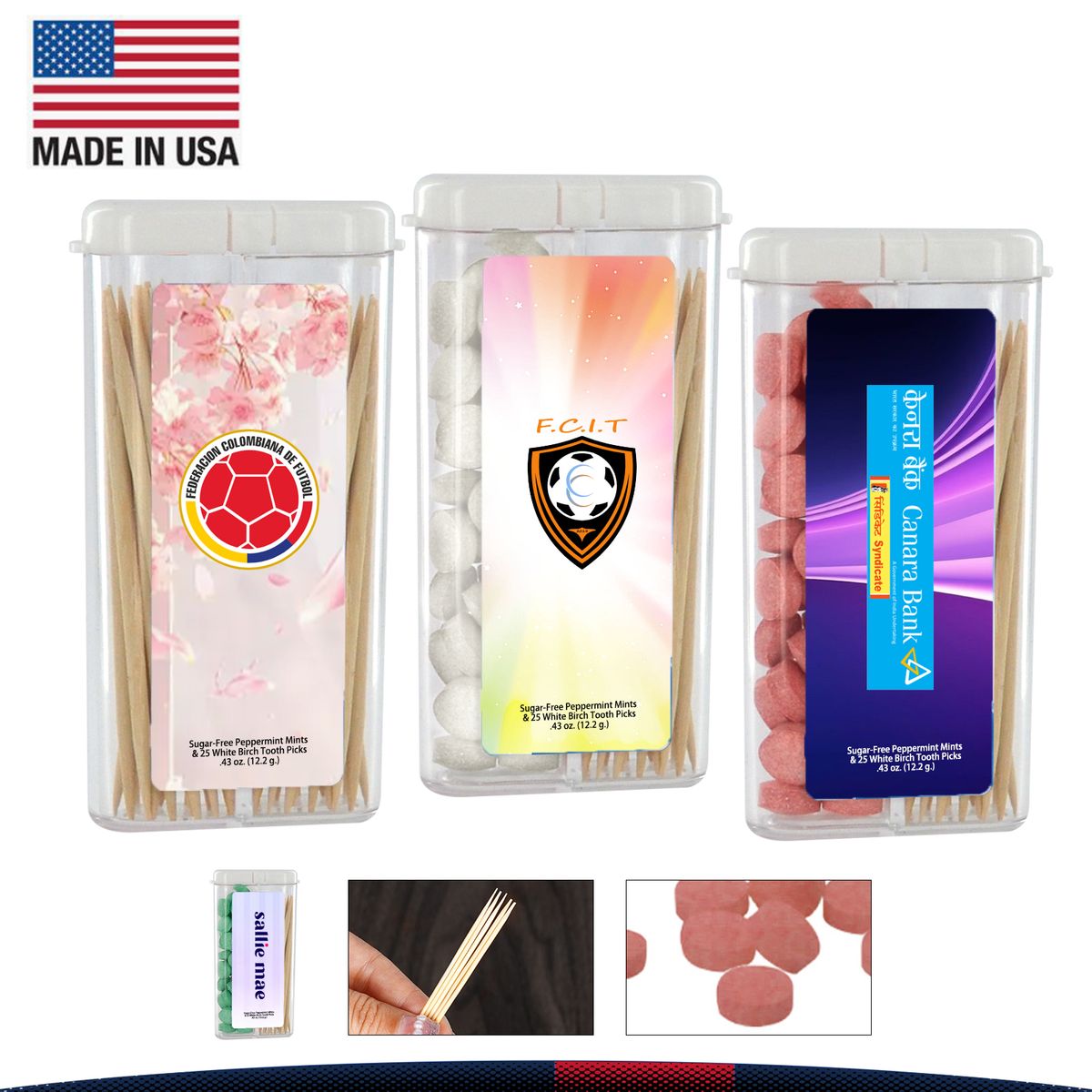 Solve two post-meal problems at once with the Xanthe Rectangular Flip-Top Mints and Toothpicks! This combo includes mints and approximately 25 toothpicks. The mints instantly freshen breath after eating, while the toothpicks provide a discreet way to remove food particles and help maintain oral comfort and confidence. Choose to pair mints with toothpicks or mix and match mint flavors for a customized combo. The compact size fits easily into pockets or bags, and the flip-top lid allows one-handed opening for quick access on the go. A practical and thoughtful giveaway for restaurants, travel promotions, event tables, and hospitality settings where post-meal freshness makes a lasting impression. Made in USA.